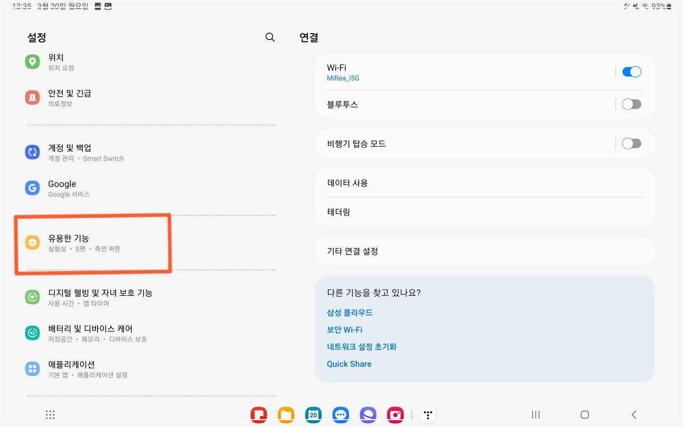 그리고 좌측 설정 메뉴에서  유용한 기능 찾아서  클릭합니다 그러면 우측 화면에서 실행이 되는데  측면 버튼을 클릭해주세요