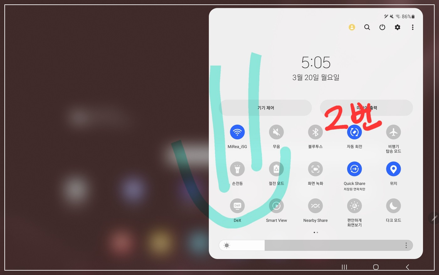 두 버튼을 동시에 누르는 것이 불편하다고 느껴지신다면 설정변경을 하시면 됩니다 화면 상단에서 하단으로 스크롤을 내리시면 나오는 상태를 활용하시면 됩니다