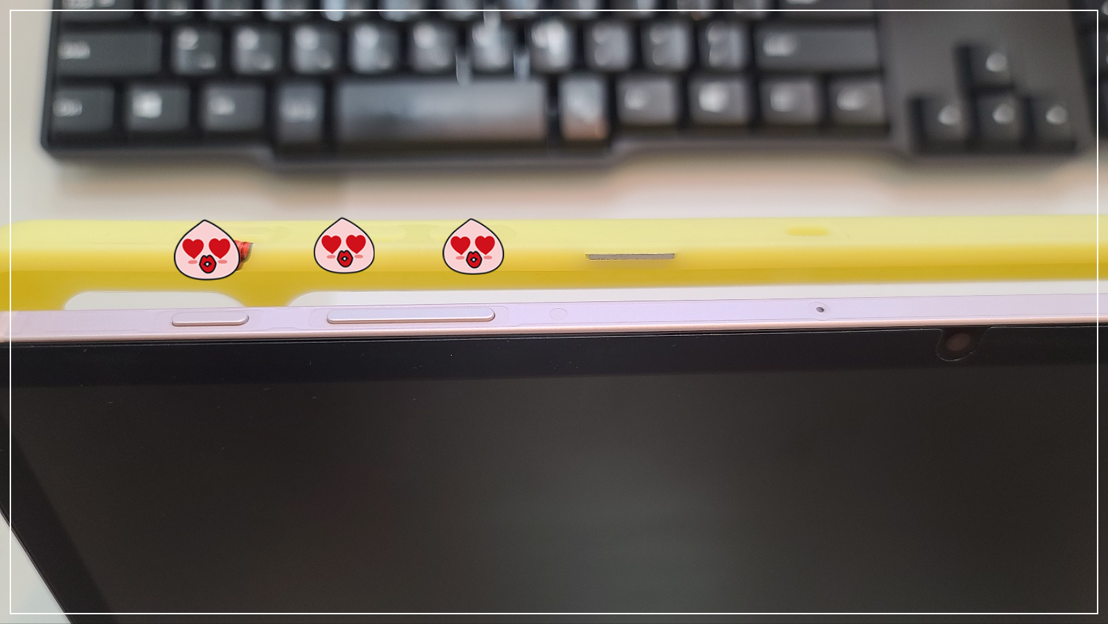 갤럭시 탭의 측면을 보면 버튼이 3개 있는데 첫 번째 버튼 그리고 밑에 두개의 버튼이 있습니다 밑에 두개의 버튼은  음향 조절 버튼입니다