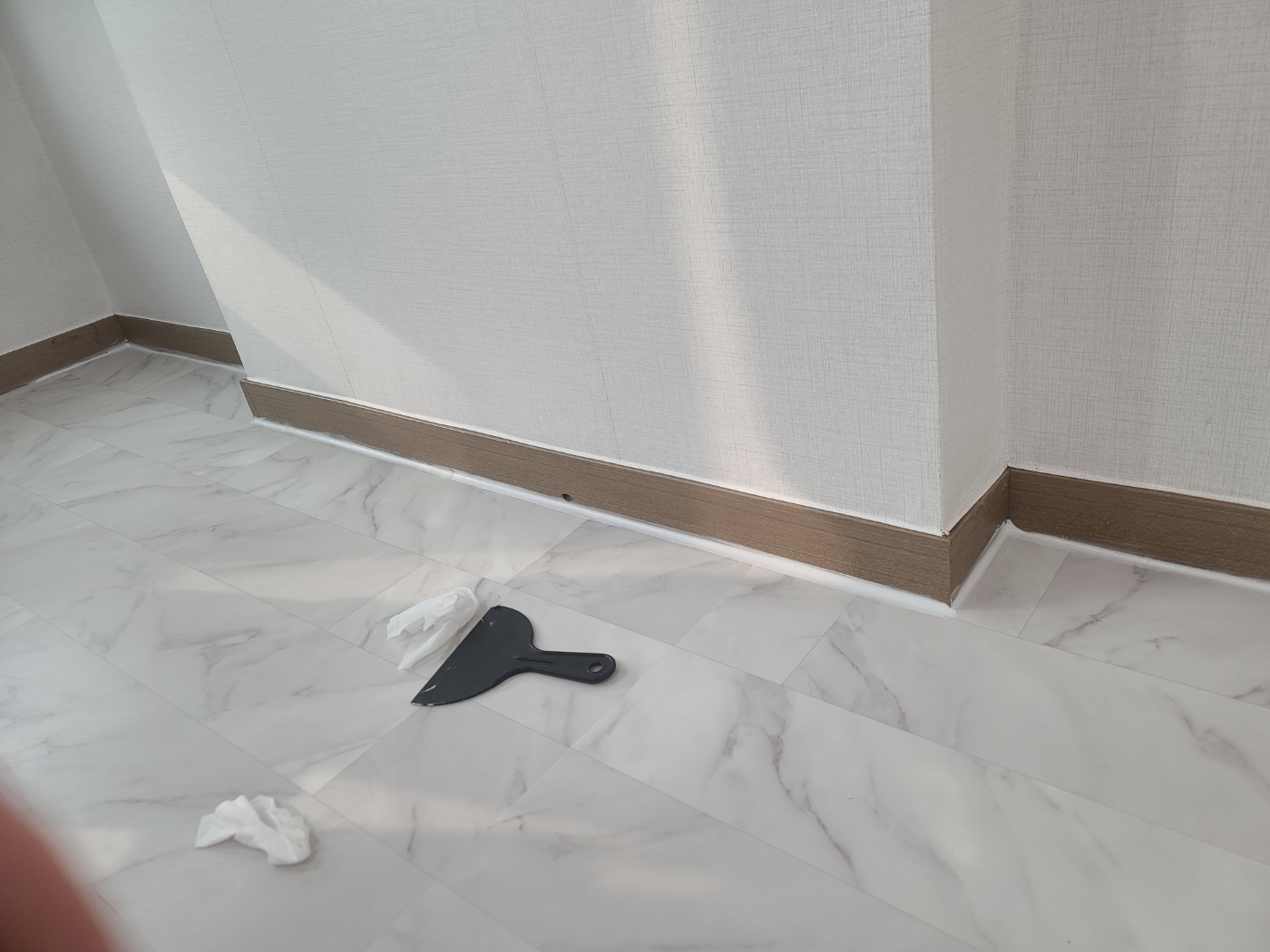 면적이 좁아 흔들림이 걱정되는 곳만 양면테이프로 고정하여 깔았습니다 그리고 마무리 테두리는 걸레받이 대신 흰색 실리콘으로 보이는 부분만 쏘아주고 마무리했습니다