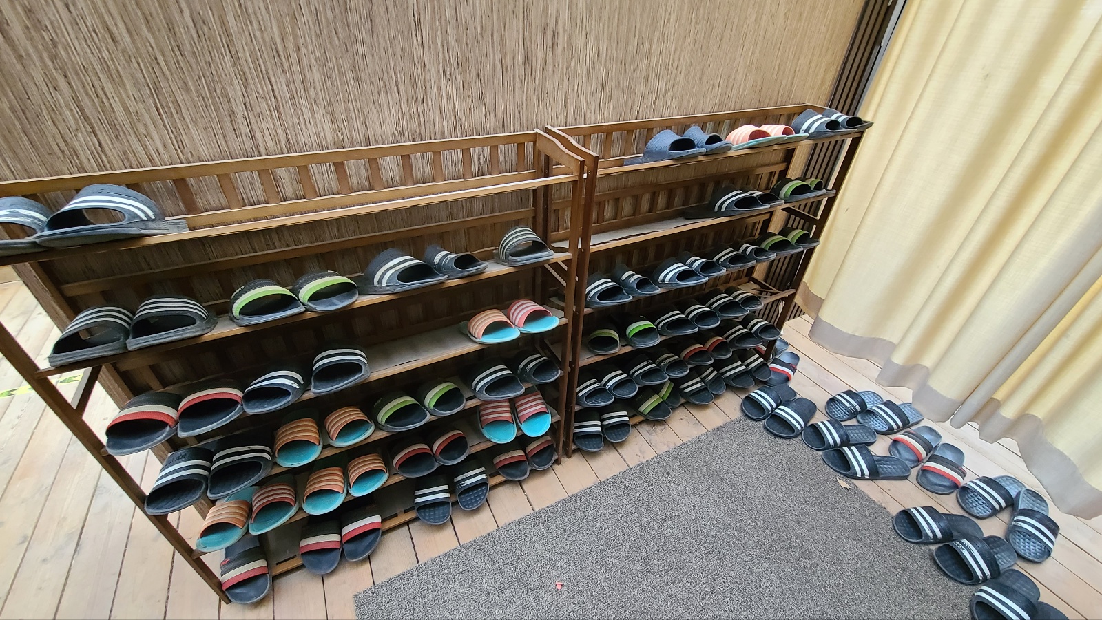 화로방 꽃방 입장 시 나막신을  신어야 하는데 이유는 슬리퍼가 녹을 수 있기 때문입니다 나막신은 앞에 진열. 정확히 말하면 너부러져 있습니다