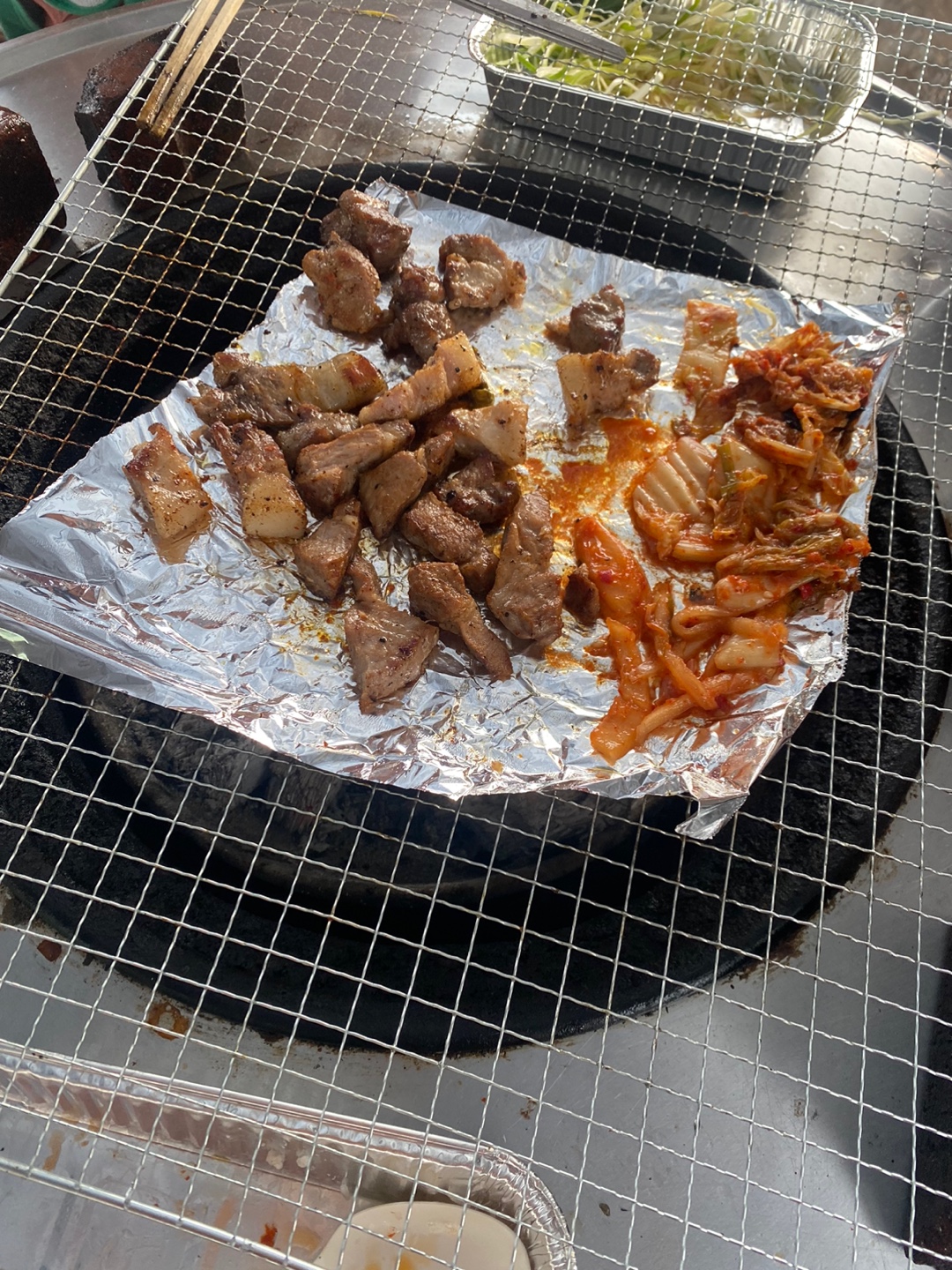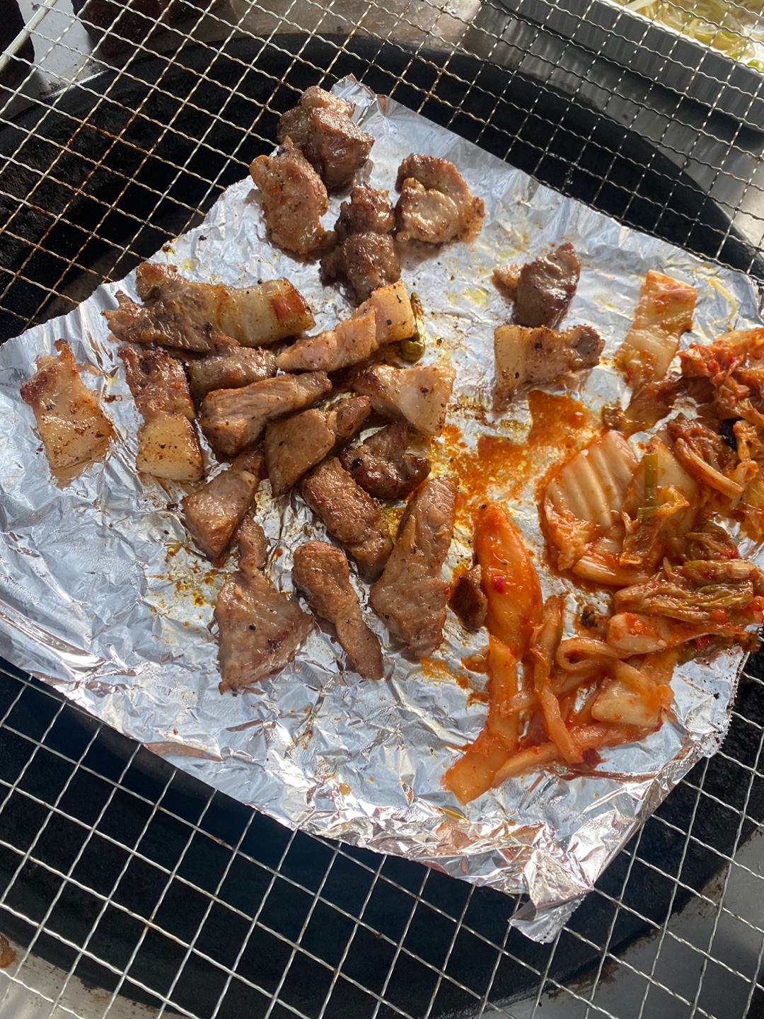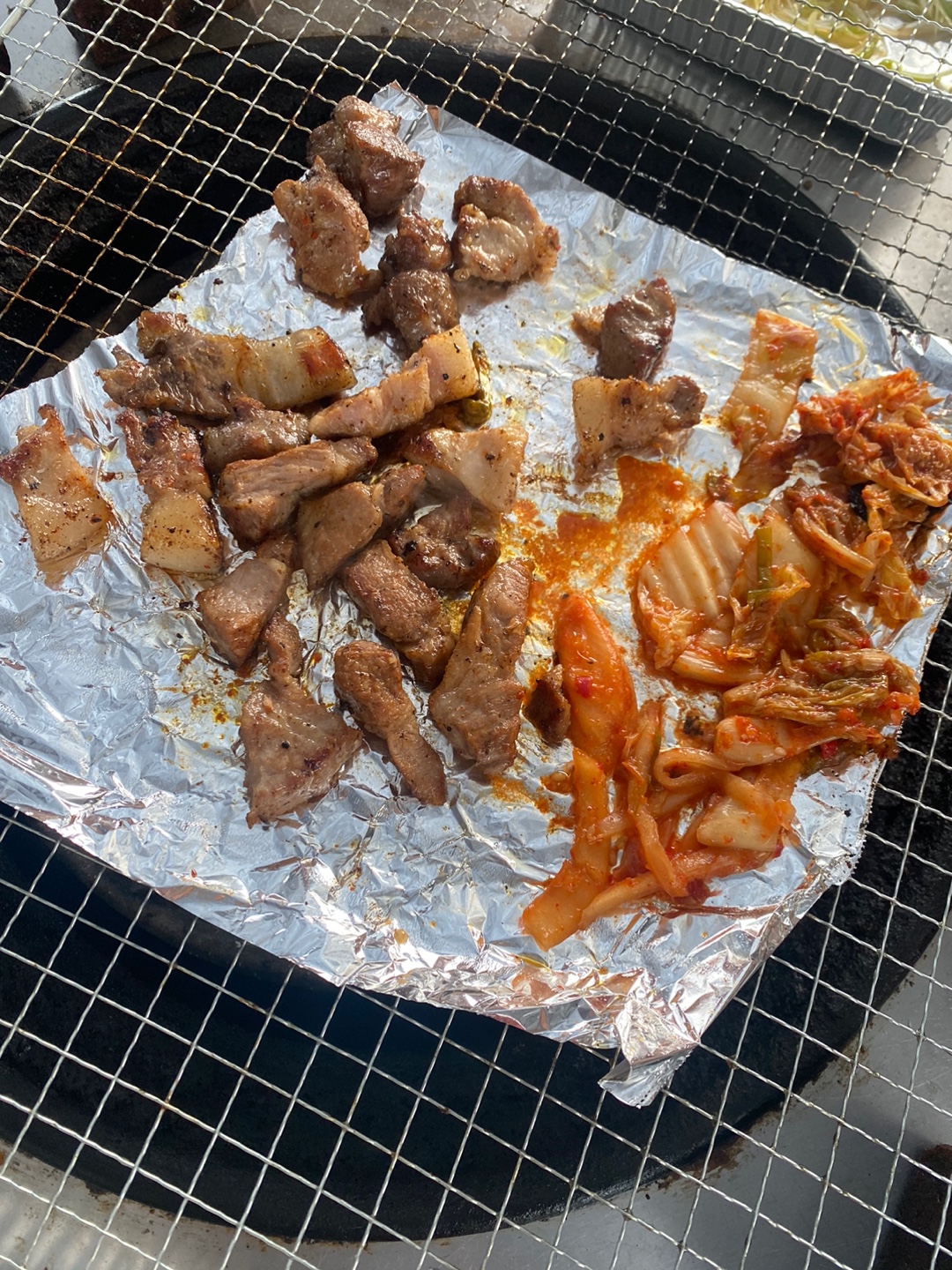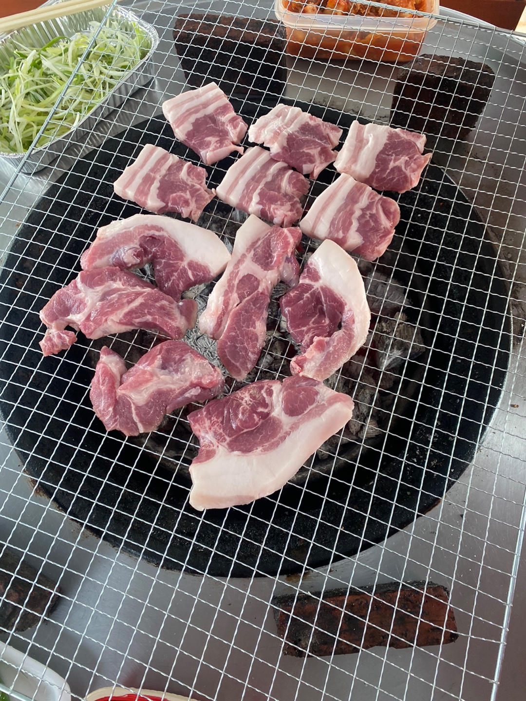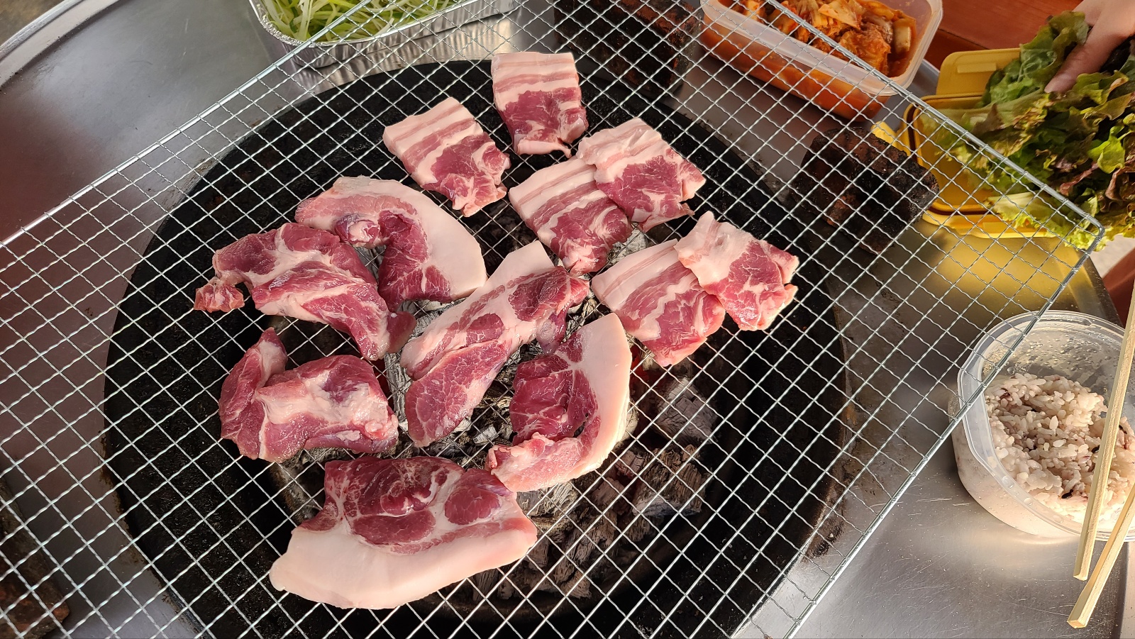 고기는 삼겹살, 목살, 항정살등 먹고 싶은 고기를 준비해 오시면 되지만 숯불 연기가 너무 강해서 기름이 적은 고기를 추천드립니다