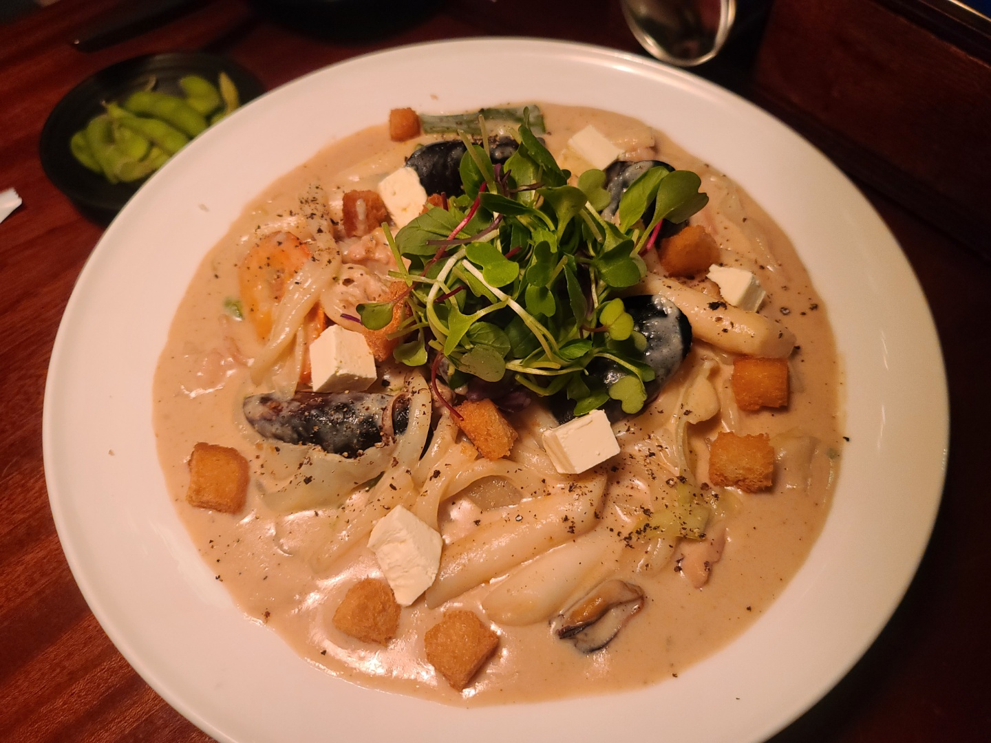 꾸덕한 크림 소스가 맛있는 까르보나라 해물 떡볶이 ! 여성분들에게 사랑받는  안주가 아닐까 싶습니다 느끼한거 좋아하는 분들이라면 강추합니다