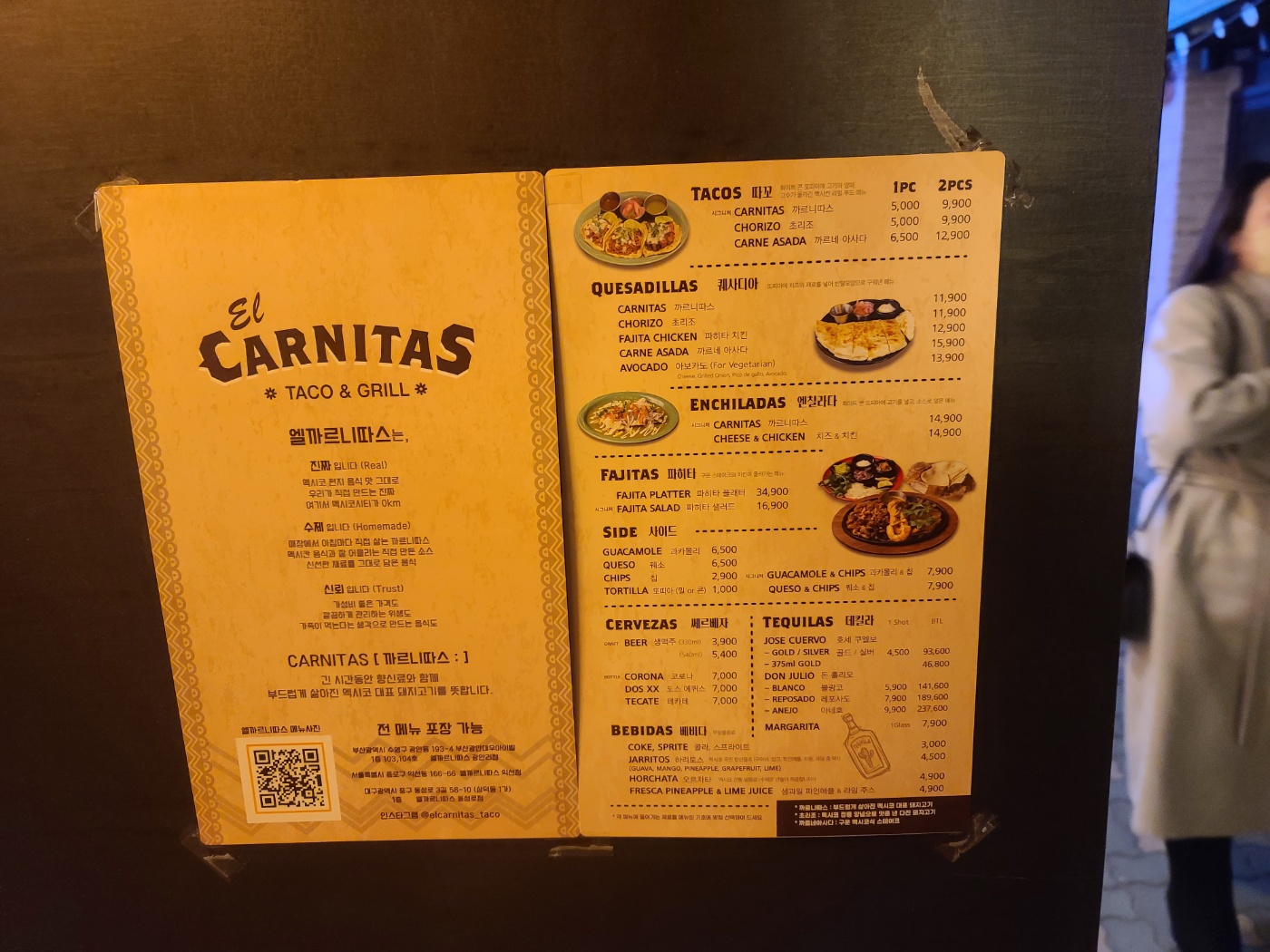 엘까르니따스는 멕시코 현지 음식 맛 그대로 직접 만드는 음식이라고 합니다 수제로 만들어지며  까르니따스는 아침마다 직접 삶는다고 하네요  멕시칸 음식과 잘 어울리는 직접 만든 소스 신선한 재료를 그대로 담은음식 그리고 가성비 좋은 음식 깔끔하게 관리하는 위생 이라는 철학을 담고 있습니다