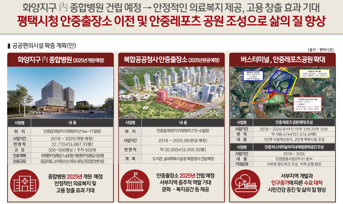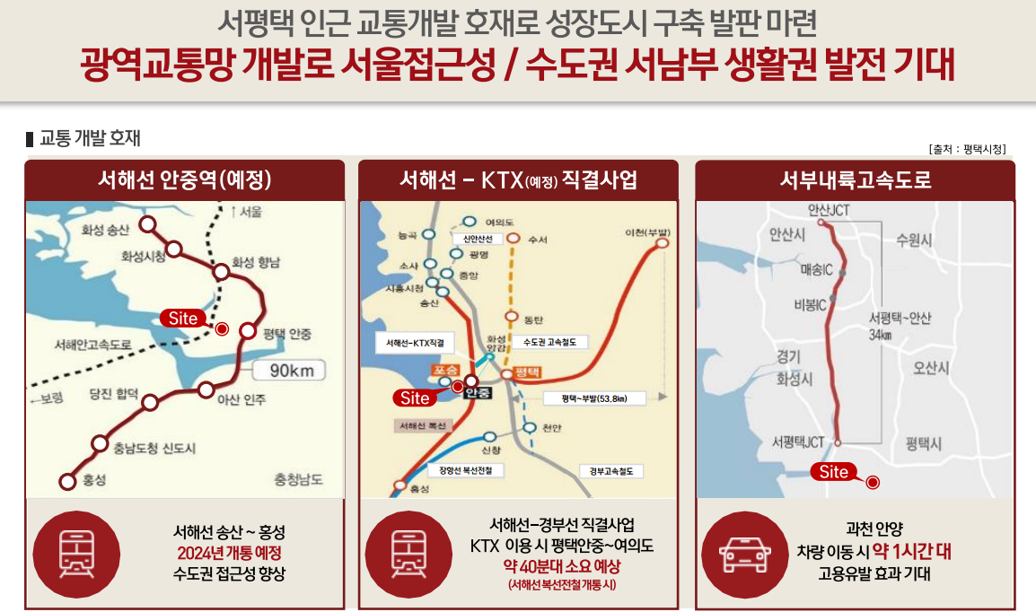 서해선 송산~홍성 2024년 개통 예정 수도권 접근성 향상, 서해선-경부선 직결사업 ktx 이용 시 평택안중~여의도 약40분대소요예상(서해선 복선전철 개통시) 서부내륙고속도로 과천 안양 차량 이동 시 약 1시간대로 교통 개발 호재로 서평택 화양지구에 관심이 집중되고 있습니다
