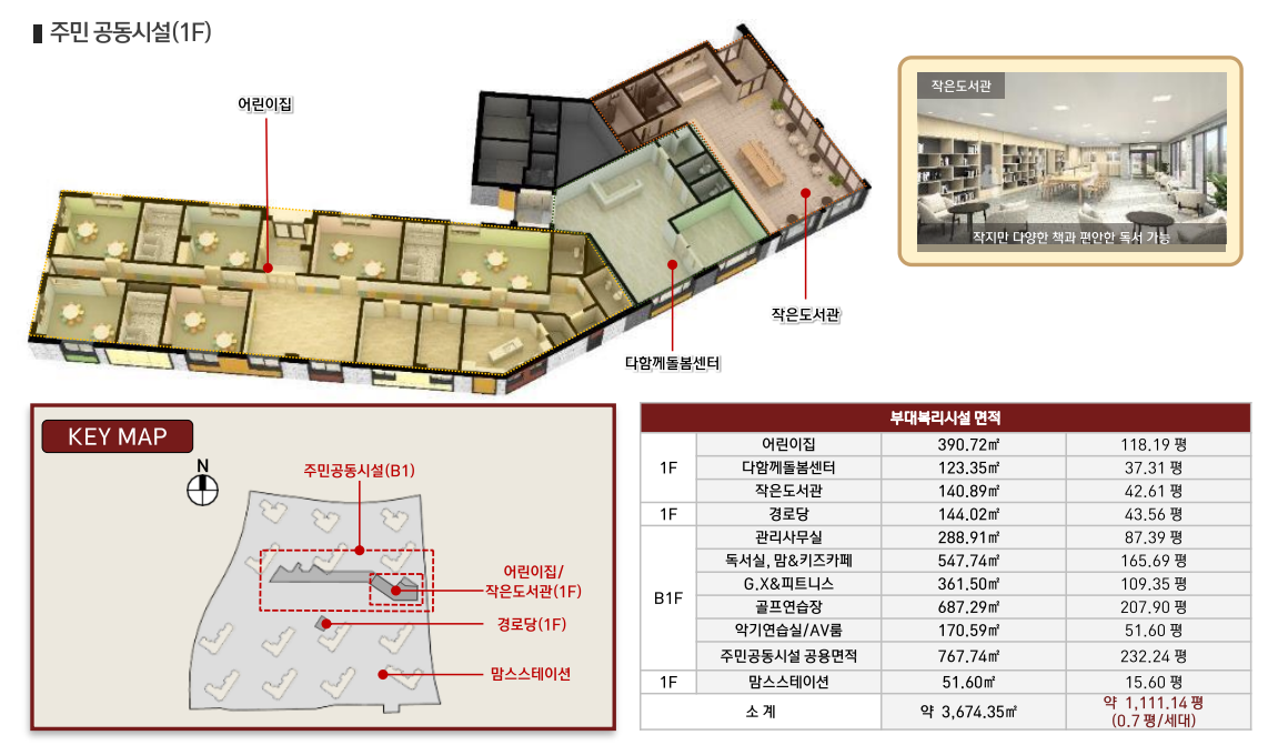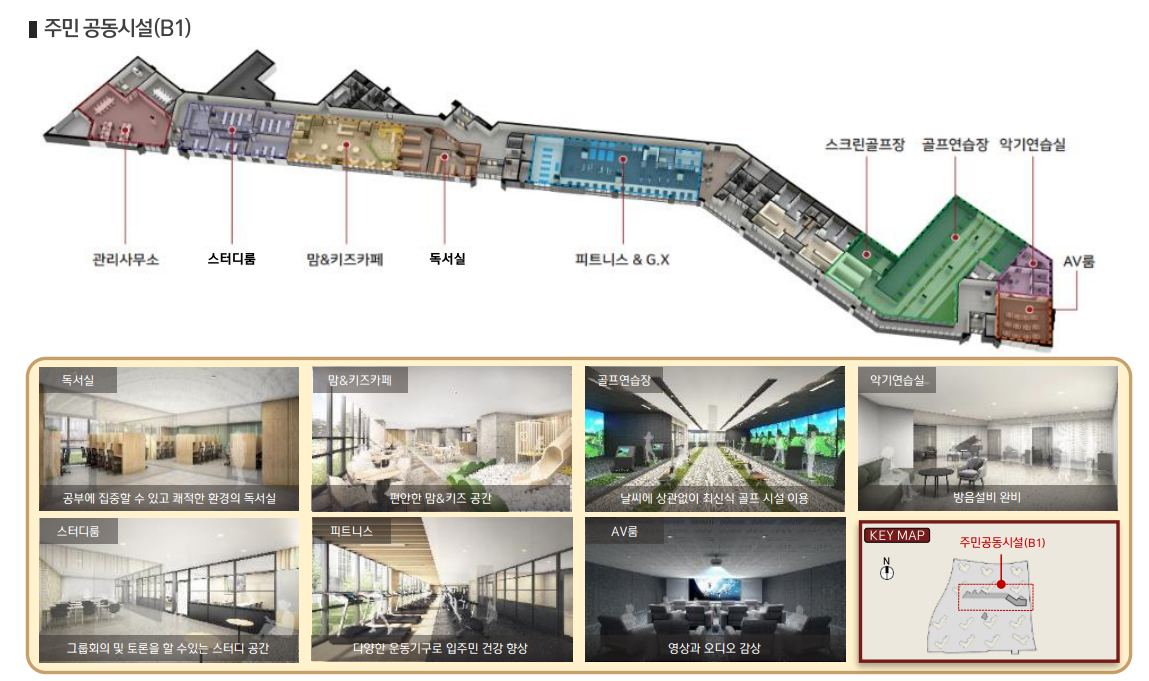 주민공동시설 커뮤니티 독서실,맘&키즈카페,골프연습장 악기연습실,스터디룸,피트니스,AV룸 등 구성되었습니다
