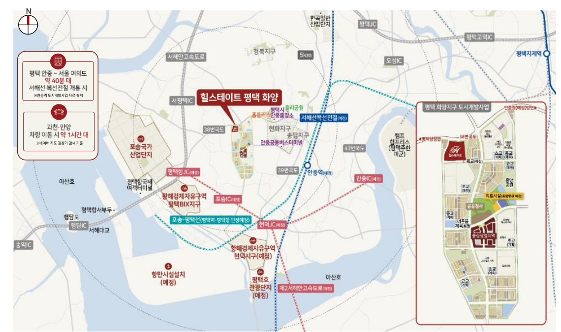 서해선 송산~홍성 2024년 개통 예정 수도권 접근성 향상,  서해선-경부선 직결사업 ktx 이용 시 평택안중~여의도 약40분대소요예상(서해선 복선전철 개통시) 서부내륙고속도로 과천 안양 차량 이동 시 약 1시간대로 교통 개발 호재로 서평택 화양지구에 관심이 집중되고 있습니다