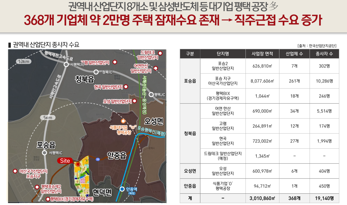 삼성반도체 등 대기업 평택 공장 368개 기업체 약 2만명 평택항 인근에 위치해 있어 배후수요도 풍부하고 이에 따라 일자리가 증가하면서 인구 유입이 꾸준히 이뤄지고 직주근접 수요가 크게 증가 합니다
