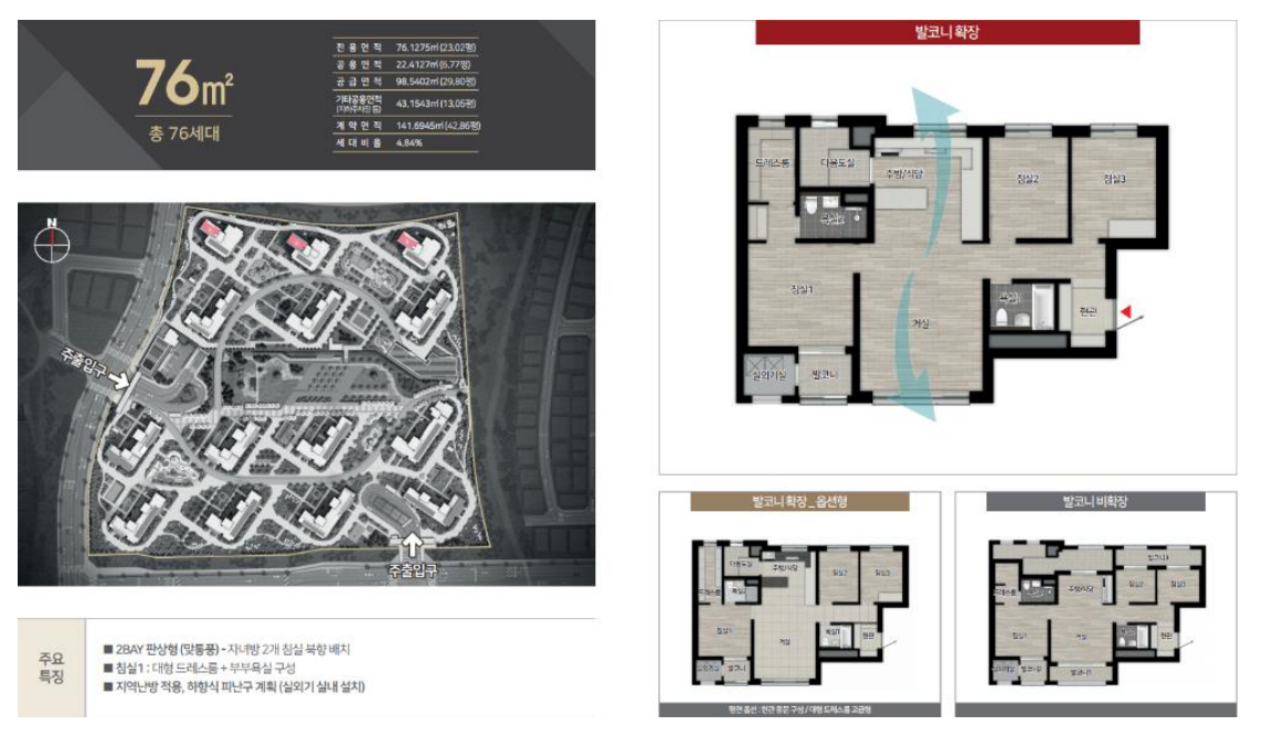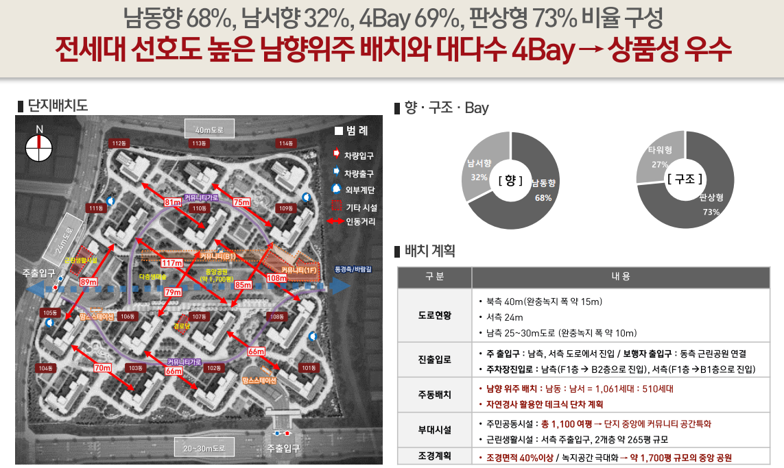 전세대 선호도 높은 남향위주 배치와 대다수4BAY, 조경면적 약 9천평 1,700여평 중앙공원, 놀이터 4개