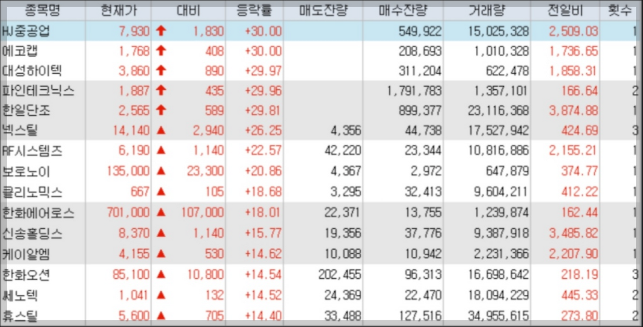대성하이텍(상한가) 한일단조(상한가) RF시스템즈(22.57%) |