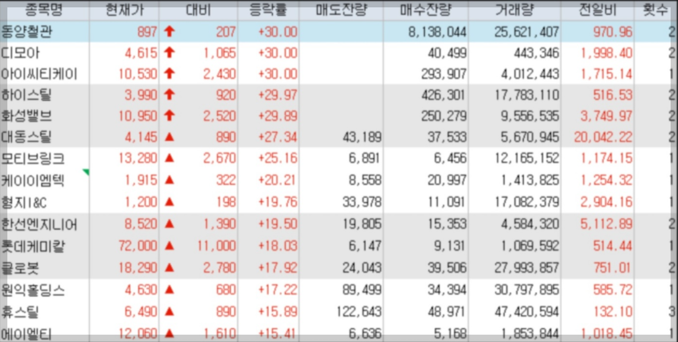 동양철관(상한가) 하이스틸(상한가) 화성밸브(상한가) |